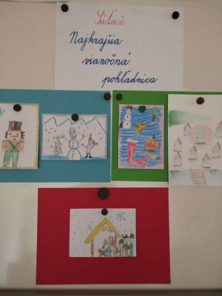 Každoročne pred Vianocami máme v ŠKD súťaž o najkrajšiu vianočnú pohľadnicu. Aj tento rok sa zapojilo veľa detí, niektoré vytvorili aj viacero prác. Víťazmi sa stali: Sárka Súľovcová - 2.ročník, Adamko Ondrejka - 3.ročník, Kristínka Urbánková - 4.ročník.Gratulujeme!